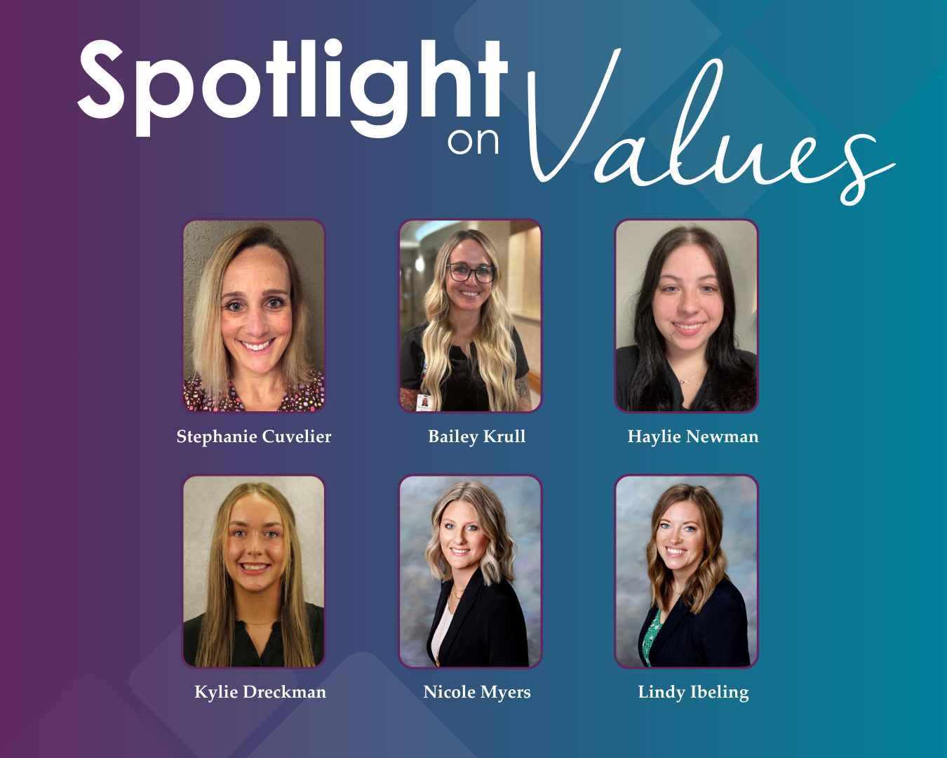 Six members of the Waverly Health Center (WHC) team have been named January/February Spotlight on Values award winners. Nominated by co-workers, patients and members of the community, these individuals are examples of WHC’s values in action.